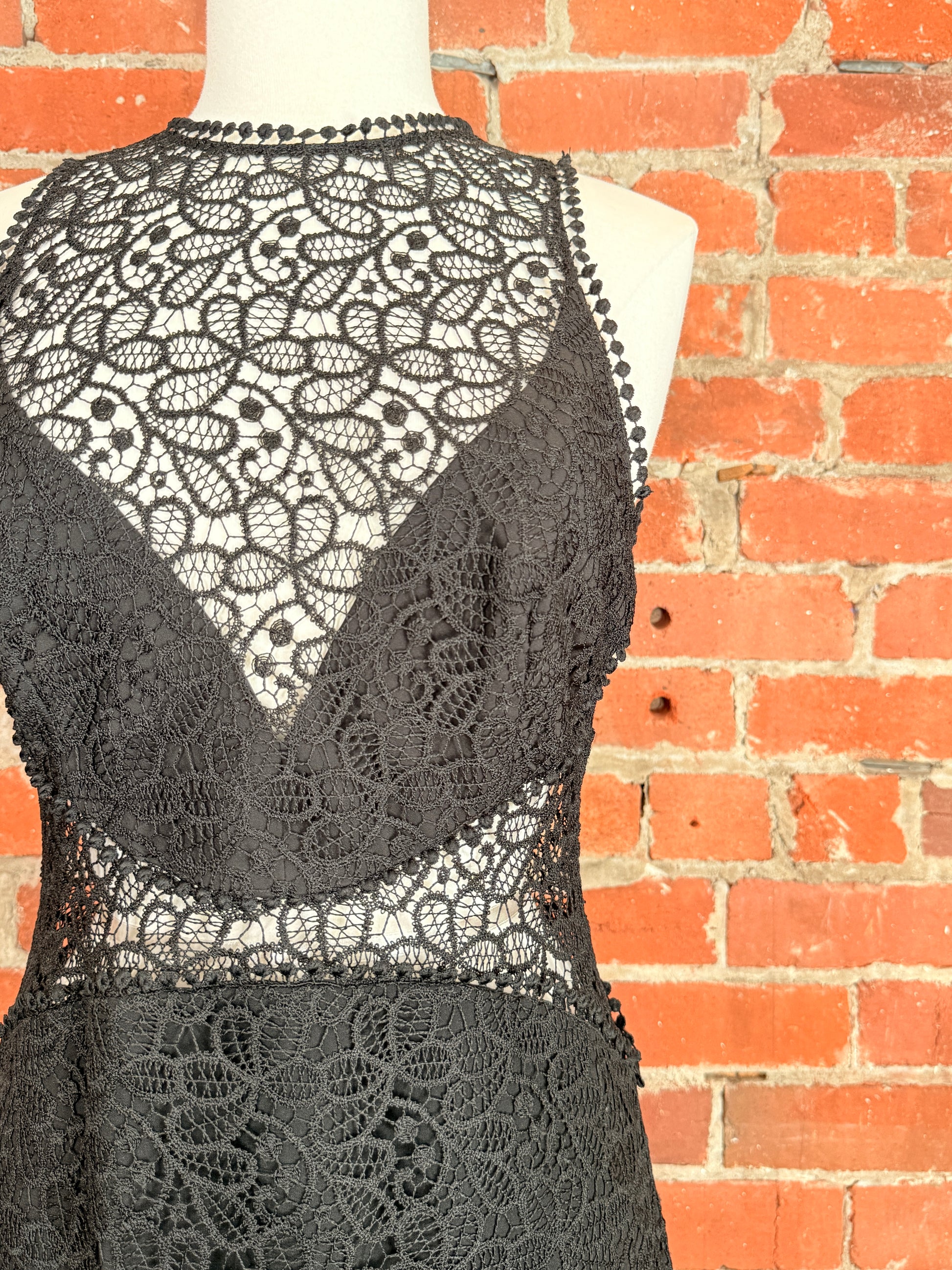 Sleeveless lace dress with material and a zipper at the back.