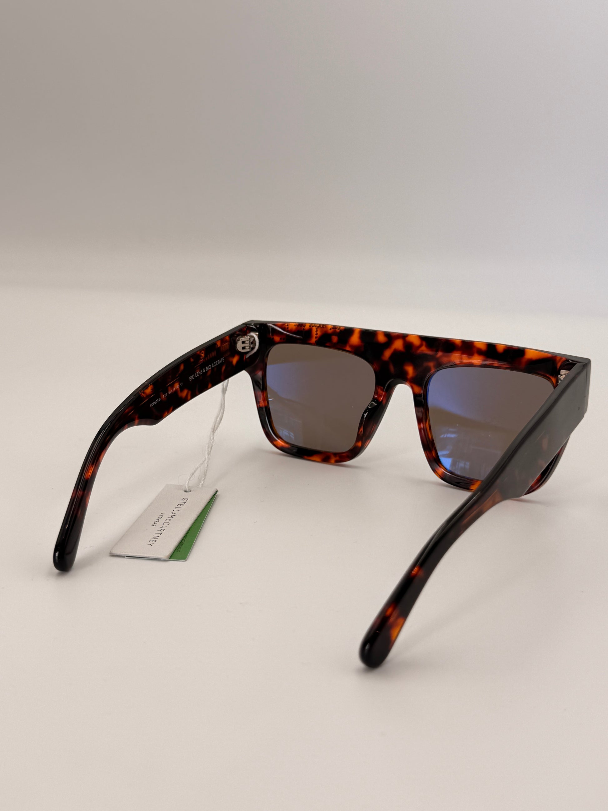 Sqaure sunglasses with a tortoise shell color, bedazzled “Stella McCartney” along the front and left side. Comes with zip case